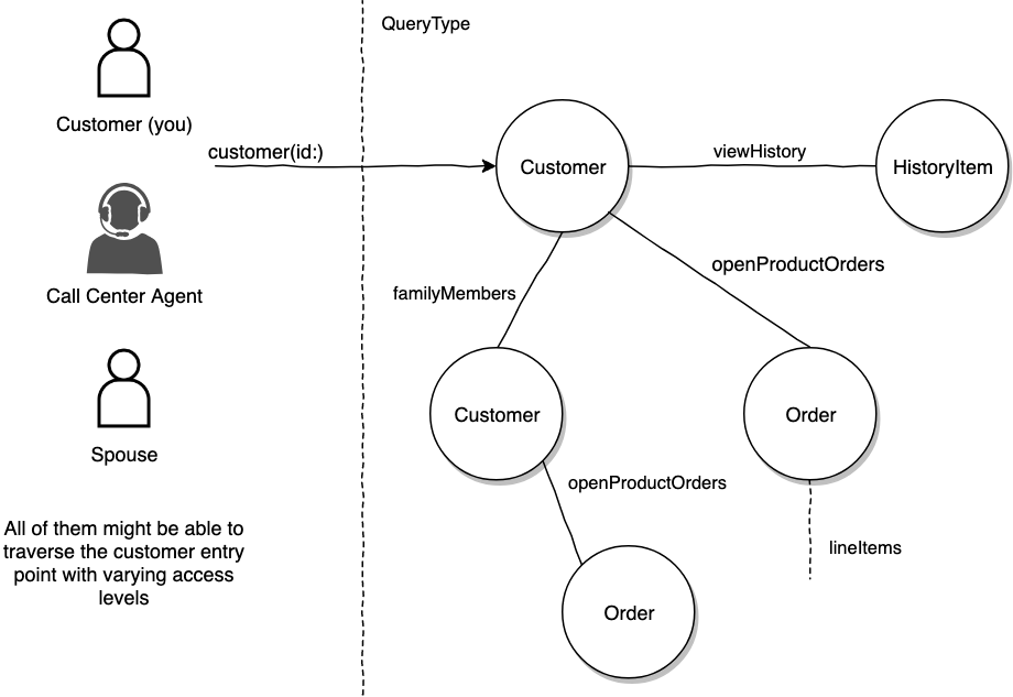 If your domain only requires currentUserCustomer type of access, this eliminates the problem of delegated access. Â Delegated access is a very real world use case which eventually finds it way to sneak into every app. Impersonation is one clear way to model this. You bequeath the rights to the agent temporarily to view all your information. That is easy to model but becoming less acceptable in the age where society is finally taking privacy more seriously.